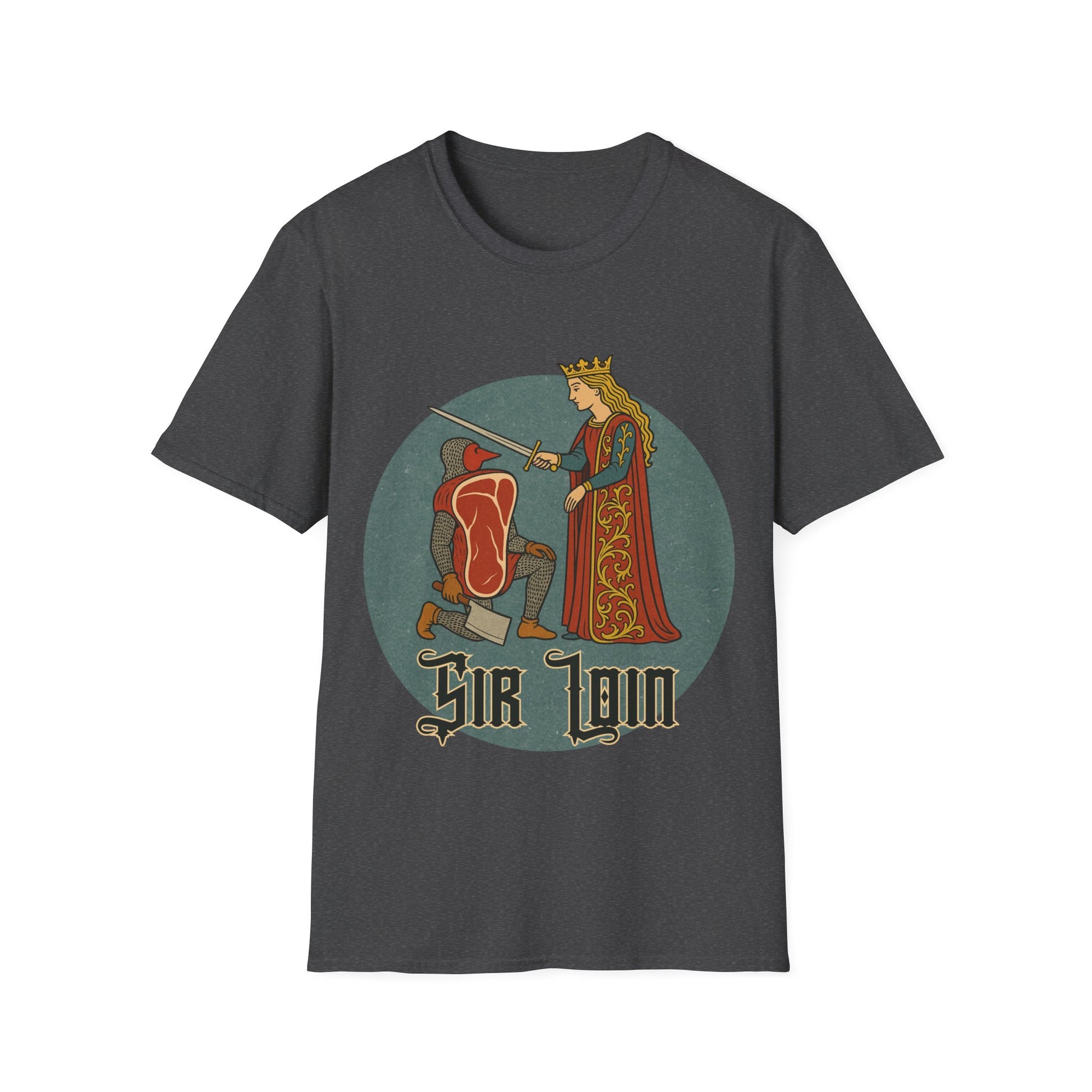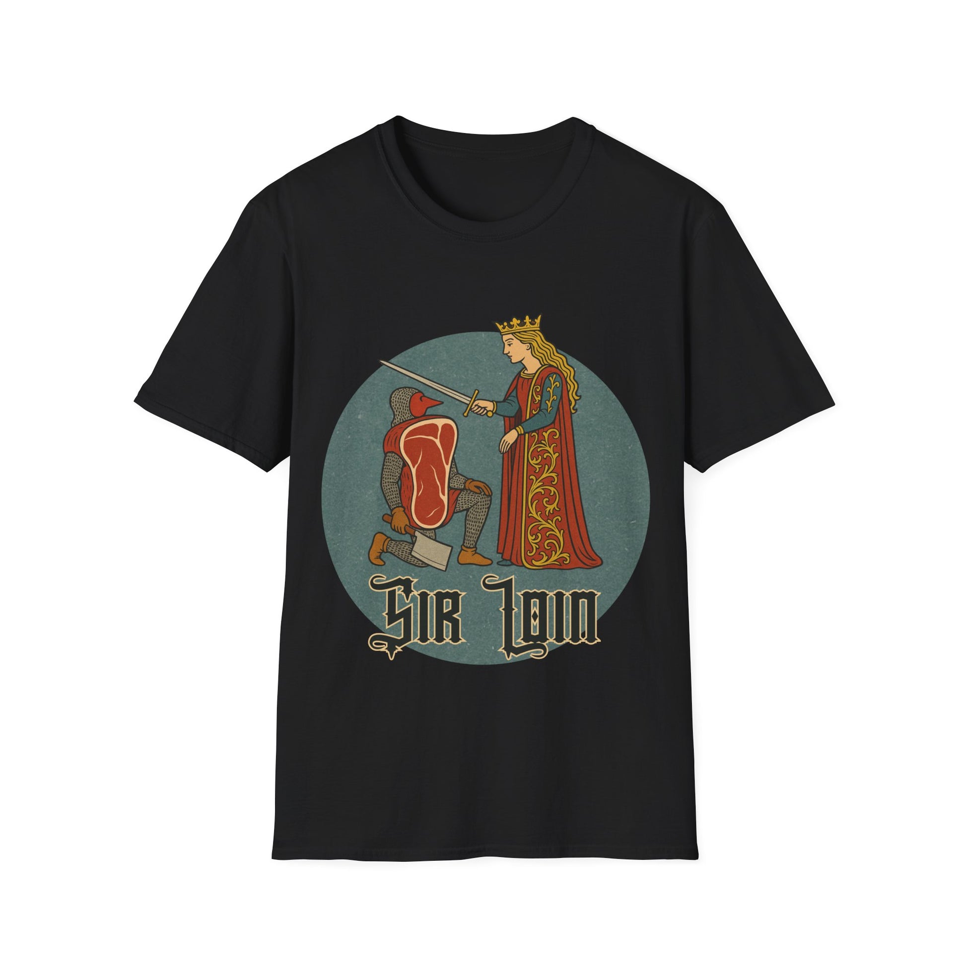 A humorous medieval-themed t-shirt featuring a "sir loin" steak parody design. This soft and comfortable unisex t-shirt is perfect for casual wear and makes a great conversation starter. Ideal for adults who appreciate quirky and fun apparel. Perfect for gifting on birthdays, holidays, or special occasions. Product features - Unisex softstyle t-shirt made from durable and smooth 100% ring-spun cotton - Ribbed knit collar with seam for elasticity and shape retention - Twill tape shoulder tape for stability and prevention of stretching - Lightweight fabric (4.5 oz/yd²) suitable for year-round wear - Ethically produced with Oeko-Tex certification and US Cotton Trust Protocol membership Care instructions - Do not dryclean - Do not bleach - Tumble dry: low heat - Iron, steam or dry: low heat - Machine wash: cold (max 30C or 90F), with similar colors